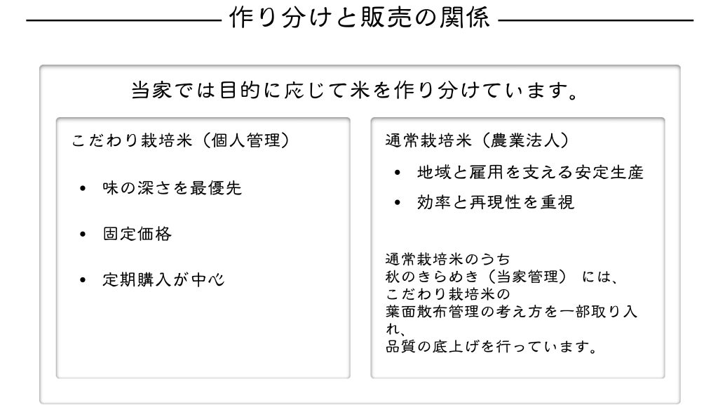 「農家の直売はいい」とよく言われます。たしかに、小規模のうちはとても有効な販売方法です。お客様の顔が 「農家の直売はいい」とよく言われます。たしかに、小規模のうちはとても有効な販売方法です。お客様の顔が見え、声が届き、感謝の言葉を直接もらえる。これは生産者にとって何よりの励みです。 しかし、規模が大きくなると見えてくる壁 直売を続けていくと、ある時から変化が起きます。物量が一気に増えるのです。 収穫量が増えるということは、その分だけ保管・選別・管理・発送の手間も膨らむということ。冷蔵庫や倉庫の維持費、人件費、出荷作業の時間……これらが少しずつ、生産者の首を締めていきます。 農産物は「生きもの」です。家電のようにアマゾンの倉庫に預けて、“売れたら送っておいてください”というわけにはいきません。 規模が大きくなるほど、直売が難しくなる理由 つまり、生き物を扱う産業ゆえの限界があります。販売を拡大したくても、管理・加工・発送の時間増える。すると、直販を頑張った分だけ栽培管理の時間が削られ。体も、時間も、すり減っていく。新たな作目への挑戦もできなくなる。 では、流通に乗せればいいのか?それにもまた、別の問題があります。 流通に乗ると「価格の主導権」が消える 市場や流通に委ねると、価格は他人が決める世界になります。自分の努力や品質よりも、相場や天候で値が変わる。結果として、収入が安定しません。 収入が不安定だと、従業員を雇うこともできない。だから「直販できない」構造に戻ってしまう。 現在の我が家の状況と、これからの販売方針 我が家でも現在、保管場所・生産管理・販売の時間的バランスを考えると、2025〜2026年の通年販売予定量が限界になります。 特にお米に関しては、2025年産米が「定期購入で埋まった場合」、それ以降の販売は収穫期の一括納品・一括支払いのみになる可能性が高いです。 「こだわり米」は、増やせない理由があります。 うちの「こだわり米」は、代々大切にしてきた土の上で育つ、いわば“家宝”のようなお米です。 この田んぼは、借りものではなく、自分たちの土地。だからこそ、土を時間をかけて育む気持ちになれる。借りた田んぼでは、そこまでの想いを込めることはできません。 仮に「貸すのをやめる」と言われれば、その瞬間に積み重ねてきたものが途絶えてしまう。だから、むやみに増やすことはできないのです。 「増産」よりも「価値を深める」方向へ 増やそうと思えば、田んぼを買うしかありません。でも、納得のいく立地・環境の田んぼが簡単に見つかるわけではありません。その代わりに、お米の価値を高める新しい方法を追求していくつもりです。栽培・仕上げ・販売のあり方を工夫し、「数量ではなく、質と味で選ばれるお米」を目指します。 通年の販売量はこれから1年と同等、それ以上にはならない見込みです。だからこそ、1粒1粒に誇りを込めていきます。 それでも「自販」を続ける理由 それでも、直販という形を続けたい理由はひとつ。“安定は自分の手でつくるしかない”からです。 誰かに価格を決められるのではなく、自分の言葉で、自分の価値を伝えたい。時間はかかっても、我が家を理解してくれる人と長く直接つながりたい。そんな環境関係性をお客さんの次世代、我が家の次世代にも繋げていきたいですね  https://www.agri-sakatyou-akita-japan.com//