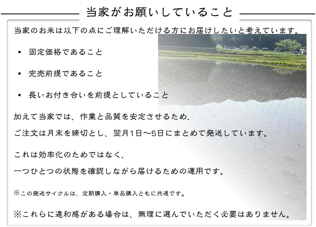 玄米以外の通常商品と定期便の発送はご注文(ご購入)いただいた翌月1〜5日発送となります。ご注意ください