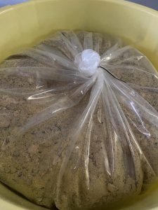 完成後、厚めのビニール袋に入れて桶に入れ、密封します。(獣被害防止と保管管理しやすい)当家の発酵は密閉発酵方式です。