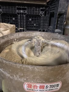 取り置きの米糠を地元酒蔵「栗林酒造」の酒粕を水に浸けて溶けやすくした後に混ぜる機械に米糠を入れ、混ぜながら酒粕液を「にぎって固まり、軽く押せば崩れるくらいまで」加えていきます。この水分量が発酵に適切な水分量となります。