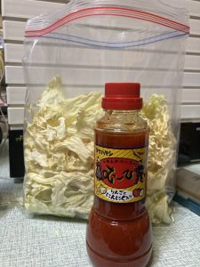 最初は結構乾燥したキャベツにキムチの素をかけて作ってみた。キムチの素の水分を捨て味が染み込みやすく、乾燥したことによってキャベツの味が凝縮されて甘味があって美味しい(雪下なので尚更)